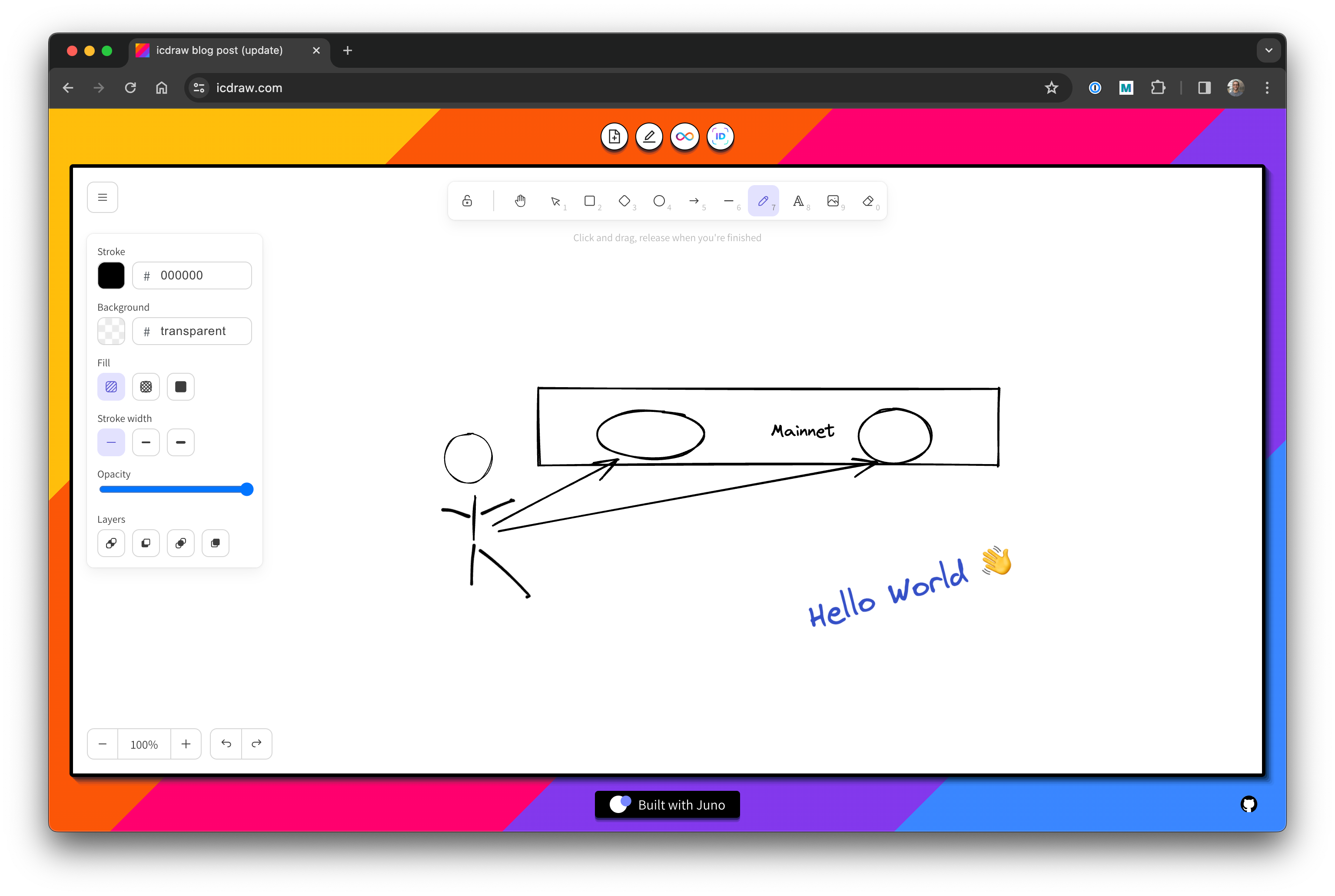 I can’t recall the exact reason, but mid-year, I found myself spending a weekend creating a dapp — which I called icdraw — using Juno. My primary motivation, as far as I can remember, was to dogfood my tools. This practice, I believe, is an excellent way to identify pain points and bugs.