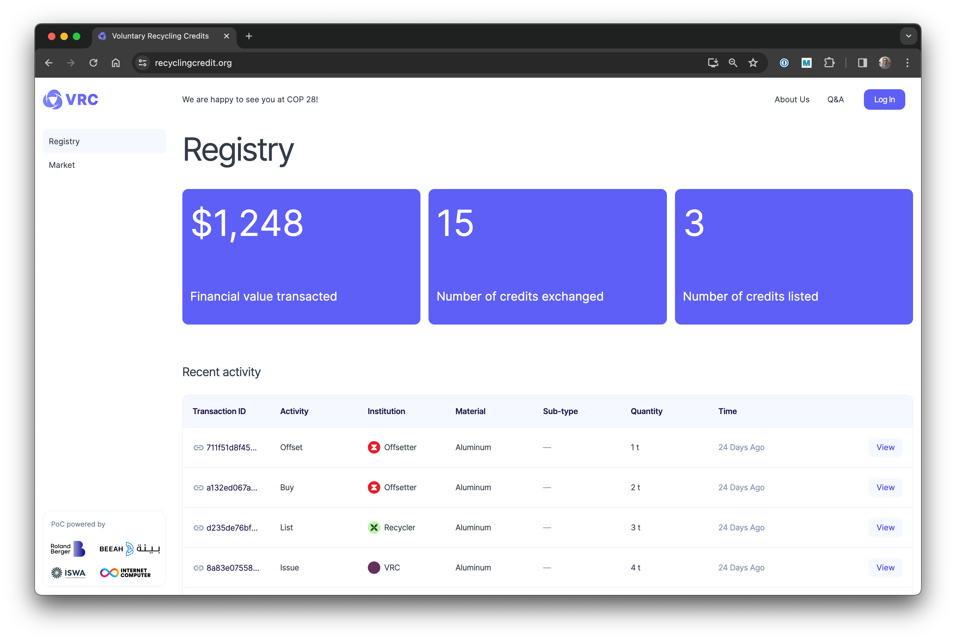 The VRC (Voluntary Recycling Credits) proof of concept is another special project we developed this year at the DFINITY Foundation, in collaboration with Roland Berger and BEEAH Group. It demonstrates how the blockchain-powered VRC standard can transform waste management by providing a turnkey solution that incentivizes recycling activities. The project was officially presented at COP28.