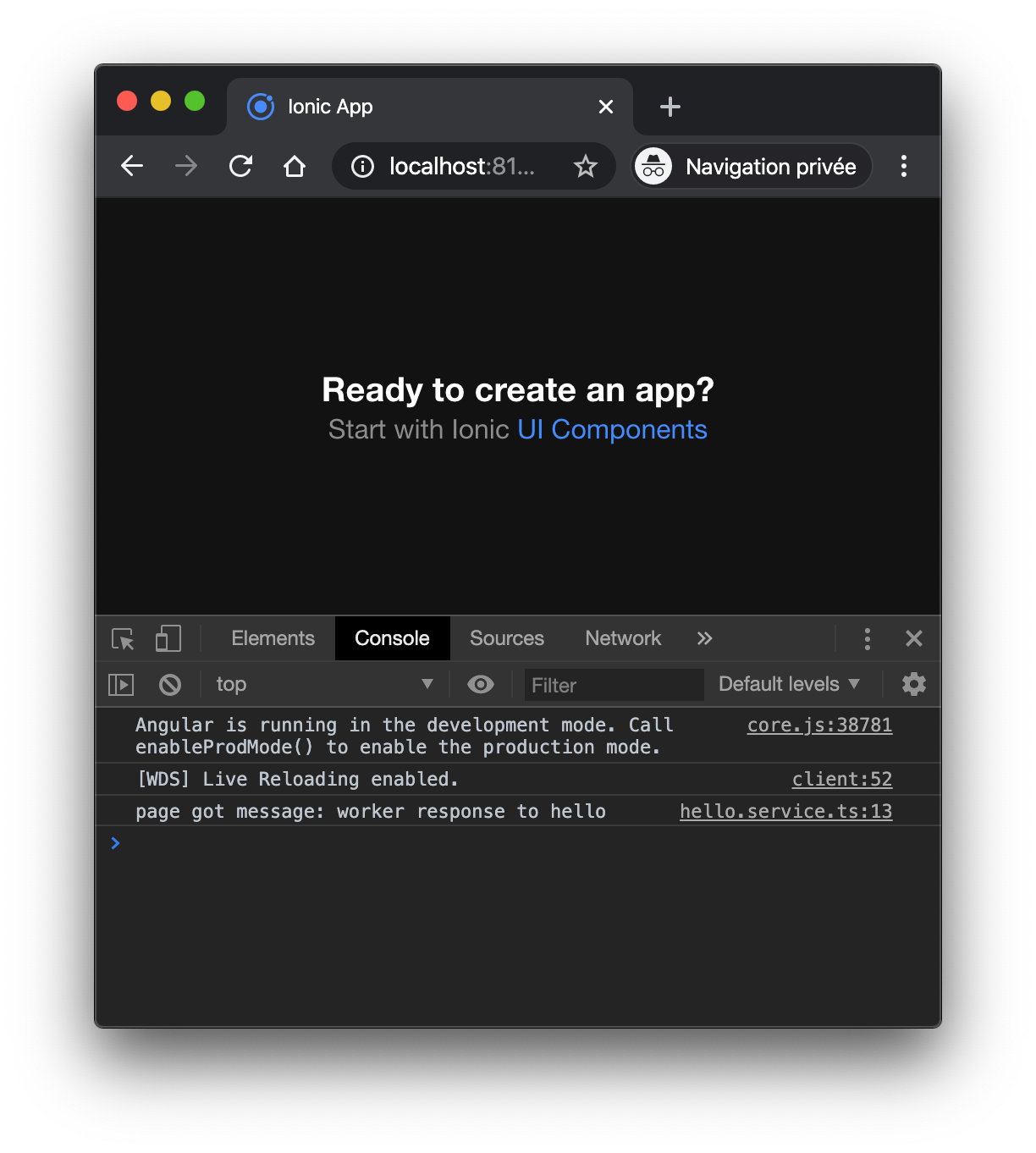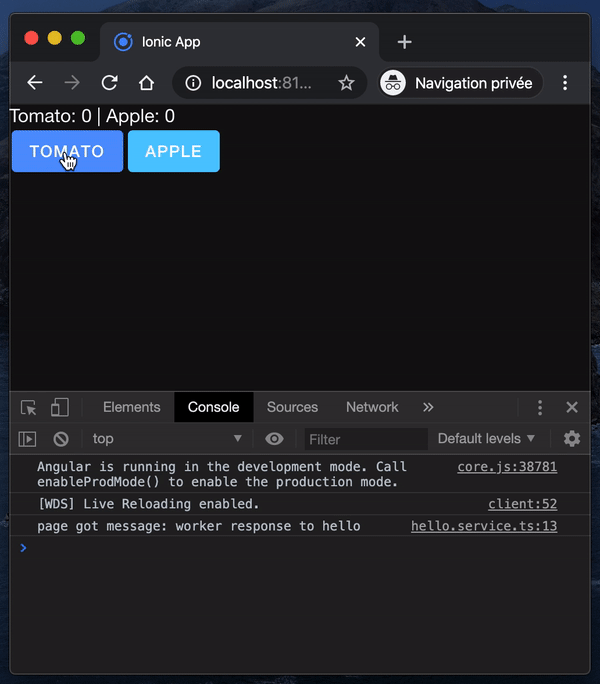 }All set, we can try to run a test. If everything goes according plan, you should be able to discover a message in the console which follow the exchange between the app and the worker.