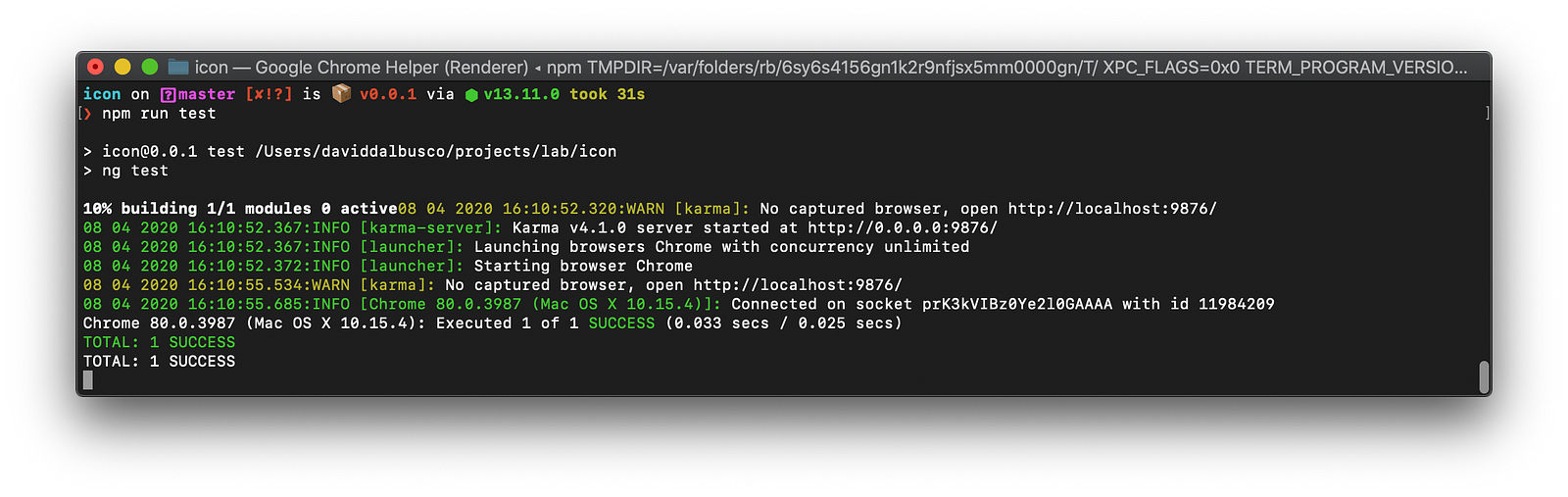 When I was replicating this test for the purpose of this blog post, I figured out that I was actually using Jasmine as it is the default test suite used when creating new Ionic Angular applications 😁.
