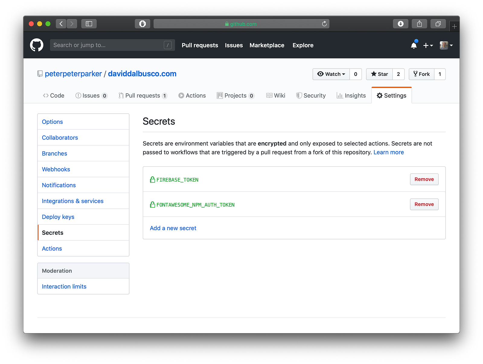 As we didnāt provided the token in the previous file, we will have to provide it to the GitHub action in a different way otherwise it will still not be able to download the dependency. Fortunately GitHub already provide an option to keep environment variables secret. Therefore we make the most of this option and we create a new secret for our Font Awesome NPM token. For example letās call it FONTAWESOME_NPM_AUTH_TOKEN.