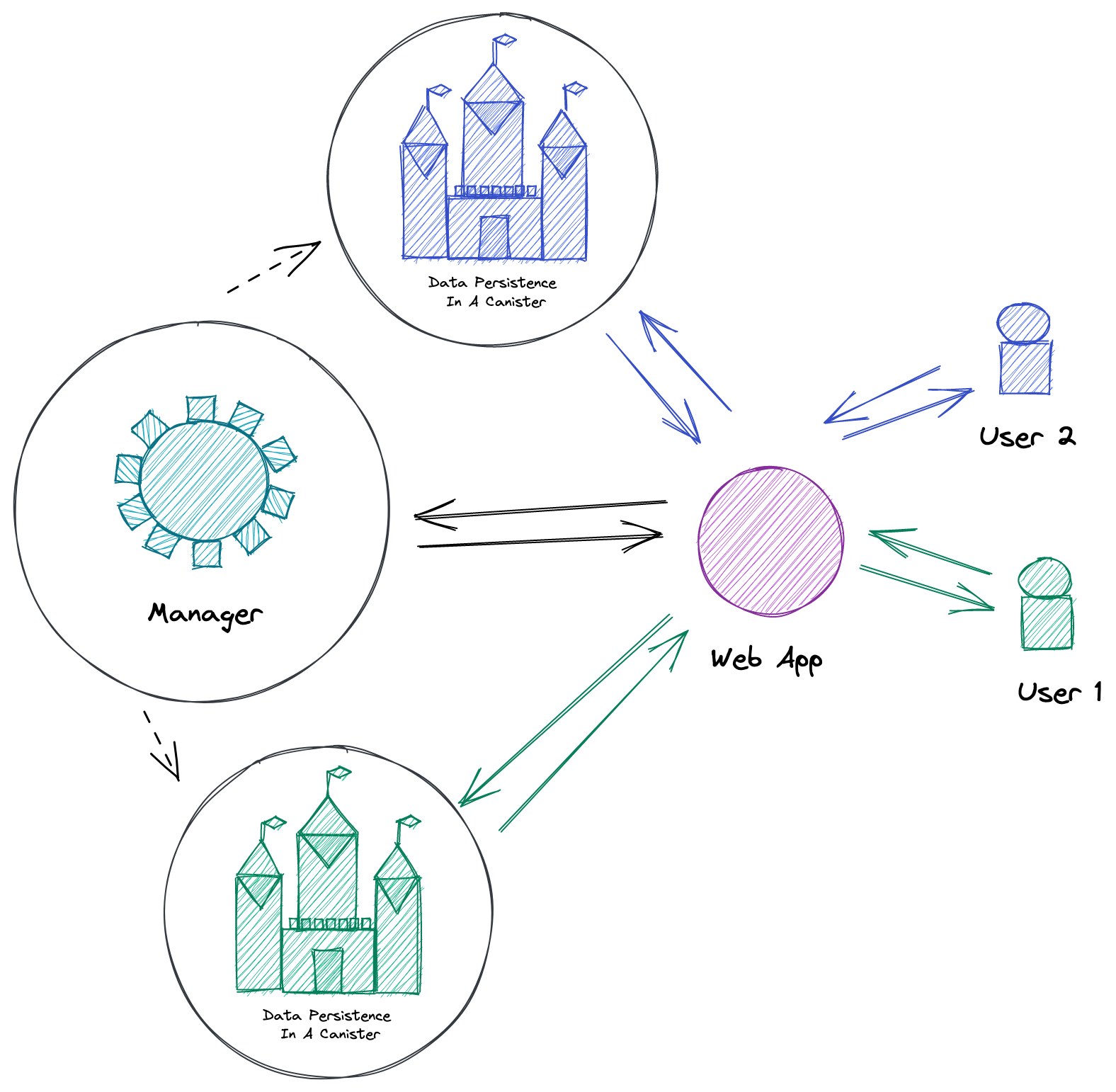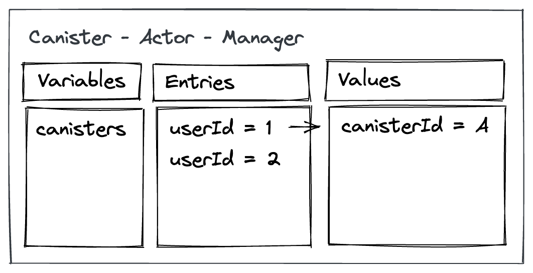 We would need two actors to implement such a solution. One that acts as a “manager”, the canister that generates other canisters on the fly, and an implementation for the canisters that take care of the data persistence, those that are generated on the fly.