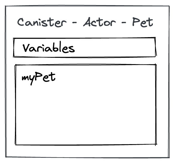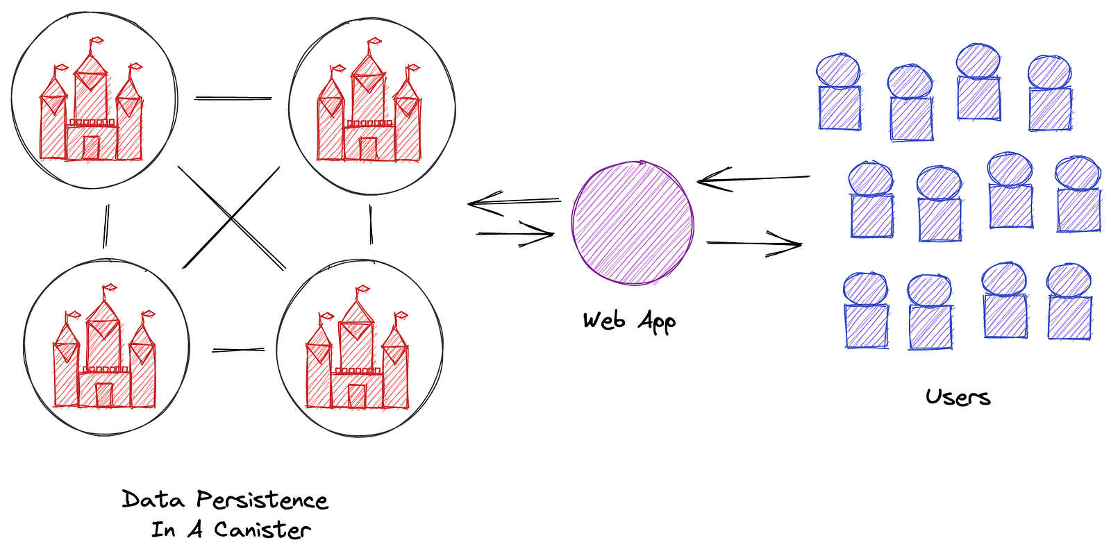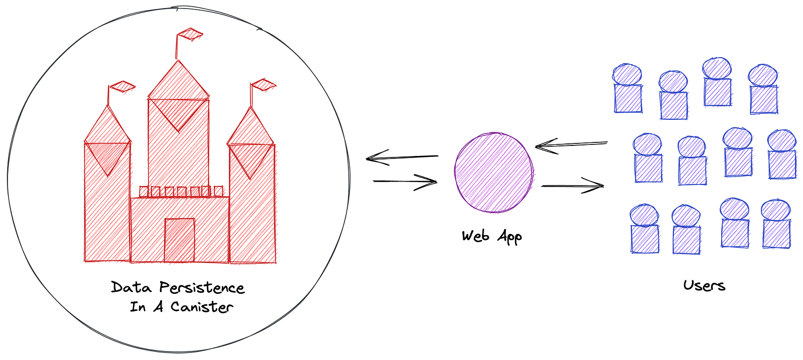 The way we can picture the persistence of the data within a canister, like we would for our "pets" web application, would be again quite similar to the previous architecture.