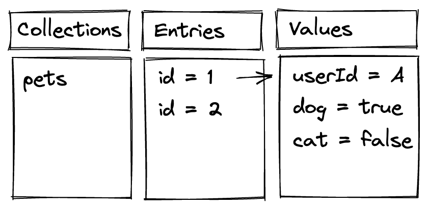 If we develop, for example, an application that lists the kind of animals our users own, we would most probably define a db collection of pets to collect their entries.